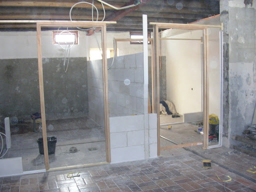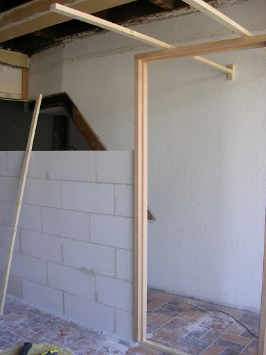 Voor de echte fans nog wat plaatjes van de gestelde kozijnen. De eerste stellatten zijn vandaag verdwenen en ook heeft Patrick een mal gemaakt voor de douchedeuren zodat we daar omheen kunnen metselen. En geloof het of niet, vandaag is de derde pallet cellenbetonblokken aangebroken!