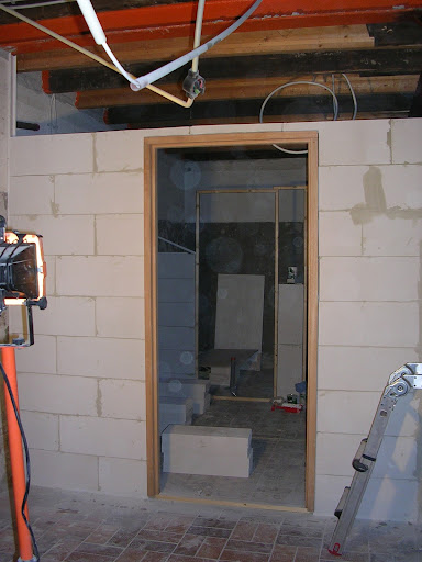 Hoger dan drie blokken per keer kan niet, omdat er om de drie blokken een anker de muur in moet. Daarvoor moeten de gelijmde blokken wel goed droog zijn. (vanwege ons verschrikkelijk rechte huis (not), moeten we met behulp van de ankers nog wel een beetje bijstellen). Omdat het muurtje buiten wel erg snel ging, zijn we meteen verder gegaan met de muur tussen de badkamer en de berging/inloopkast. Ook hier drie blokken hoog: