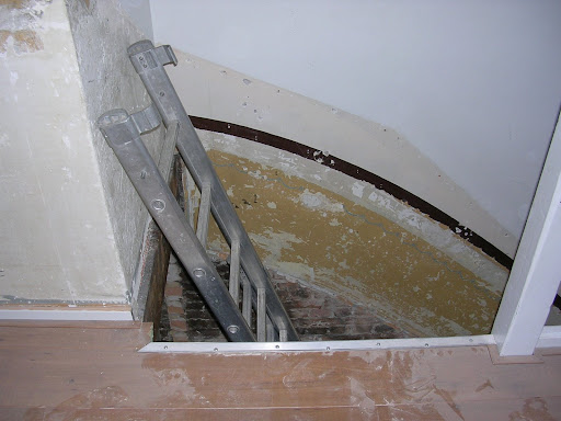 En zo ziet onze strakke entree er nu uit. Tsja, ruimtebesparend is het wel maar toch is het fijn dat de aannemer morgen terugkomt om een bouwtrap te maken. Onze nieuwe trap komt pas ergens eind oktober is de verwachting. En om nou tot dat moment iedere dag een paar keer een ladder op en neer te gaan leek ons geen strak plan.
